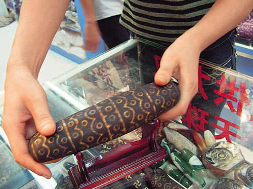 许多天珠业者都在广州荔湾广场批货,各型各色的天珠可随业者发挥,竟可见到保温瓶大小的天珠。
