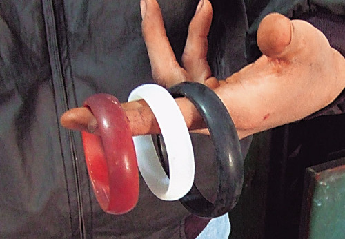 白色玛瑙(中)染色成红(左)、黑(右)色,就被业者混充红、黑玉髓。
