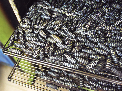 染剂经过高温,让原本灰白色的玛瑙呈现黑色,用刀片划过的线条,则维持白色,几千颗的天珠就这样完成了。
